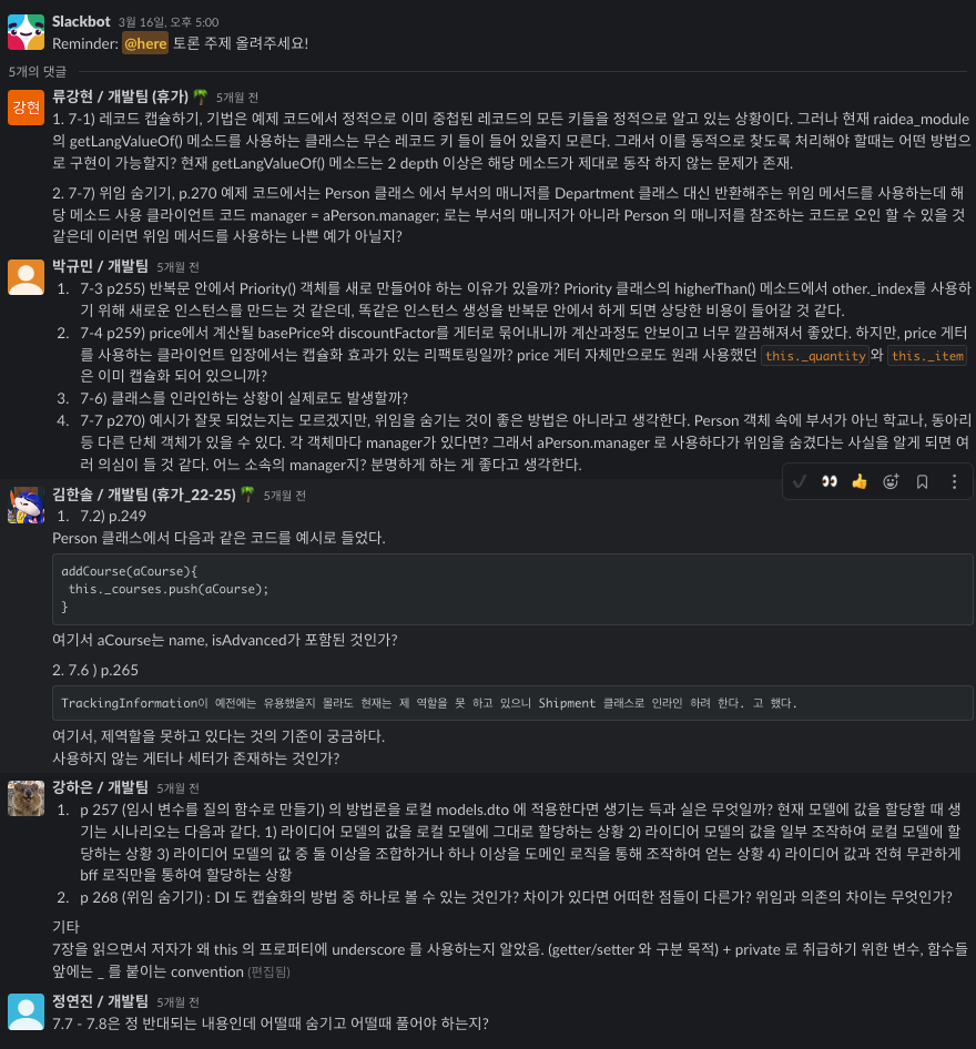 처음에는 "다같이 똑같은 범위를 읽는데, 토론 주제가 다양하게 나올까?" 하는 의구심이 들기도 했으나, 첫 스터디 회차부터 이는 기우였음을 깨달았습니다. 각자의 성향이 다른 것처럼 개개인의 개발 스타일이 전부 달랐고, 이는 토론 주제를 뽑을 때부터 드러났습니다. 덕분에 단조롭기보다 열정적이고 치열한 토론이 이루어지기도 했었습니다.